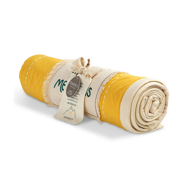 - Demdaco mustard yellow baby blanket features a mountain design and Bible verse.