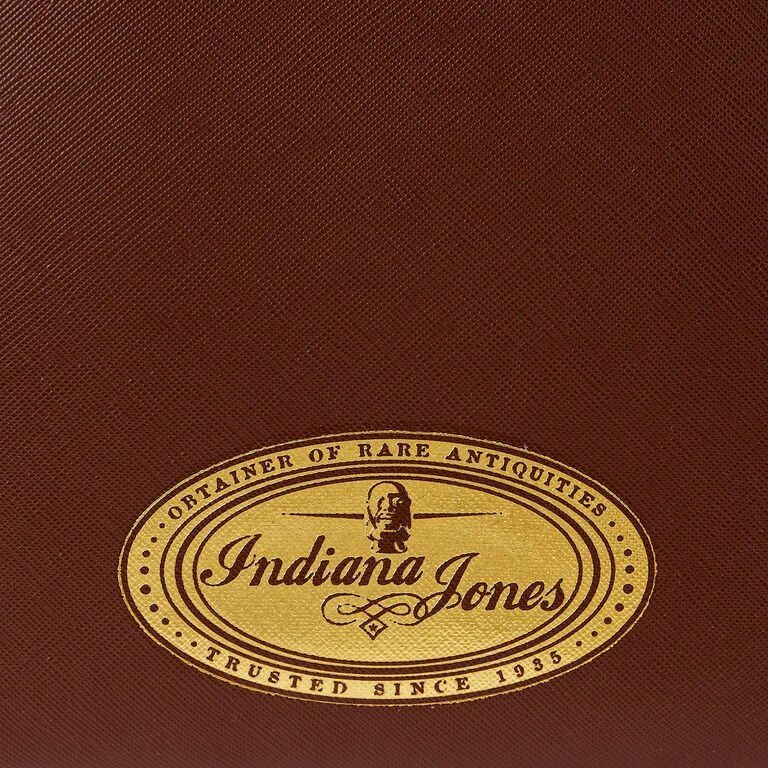 - Loungefly faux leather weathered brown miniature backpack features Indiana Jones design with printed boulder and cave scene with coordinating interior lining.