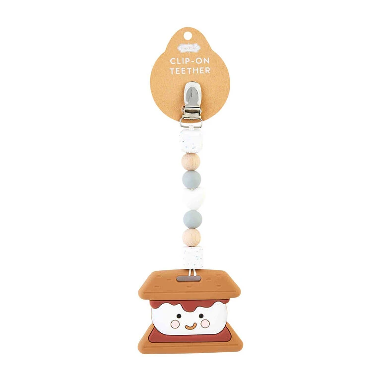 Distract baby from teething troubles with a delicious-looking s’more teether. The silicone teether features a silicone bauble strap with a clip at the end so it goes wherever baby goes to ease teething soreness. Clip-on baby teether makes a unique baby gift.